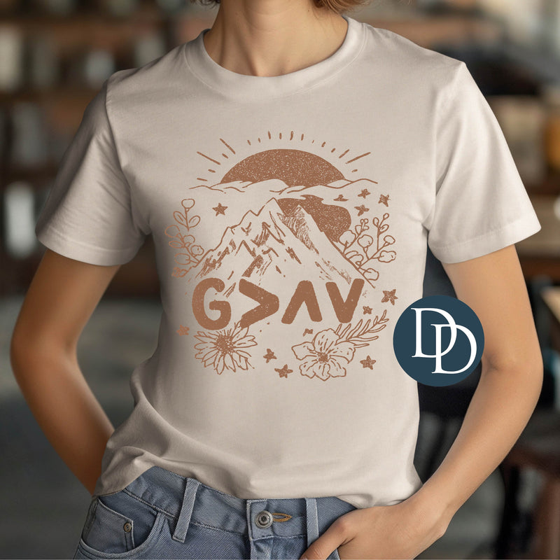 God Is Greater Mountain Sunrise (Doe Brown Ink) - NOT RESTOCKING - *Screen Print Transfer*