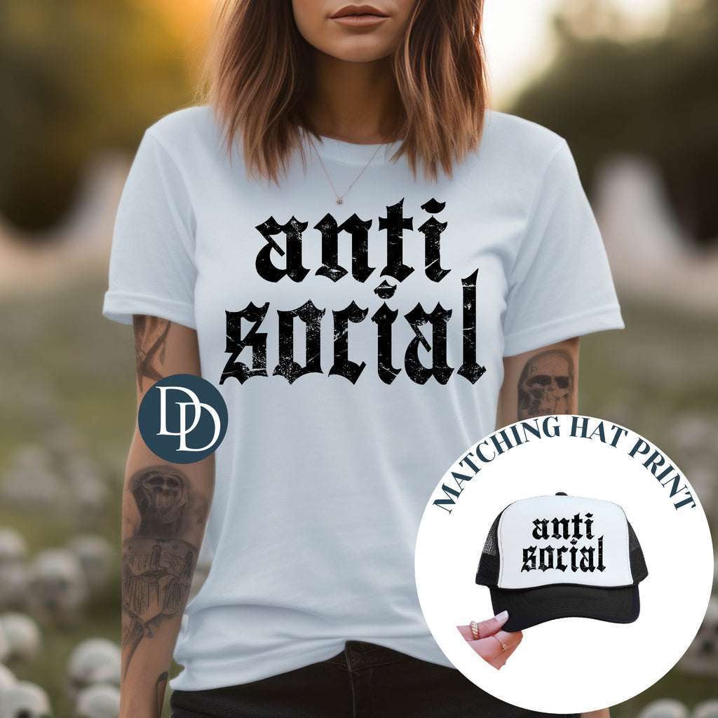 Anti Social Distressed Old English with Hat Print *DTF Transfer*