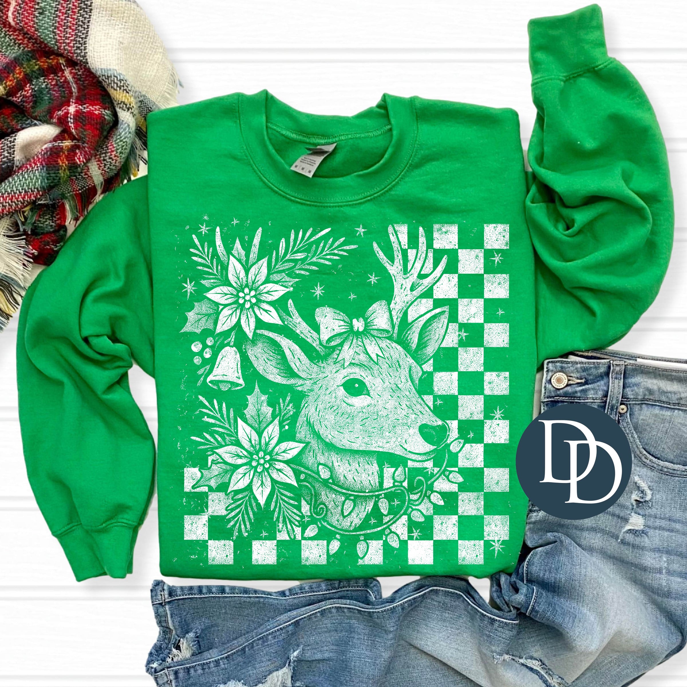 Checkered Christmas Poinsettia Deer *DTF Transfer*