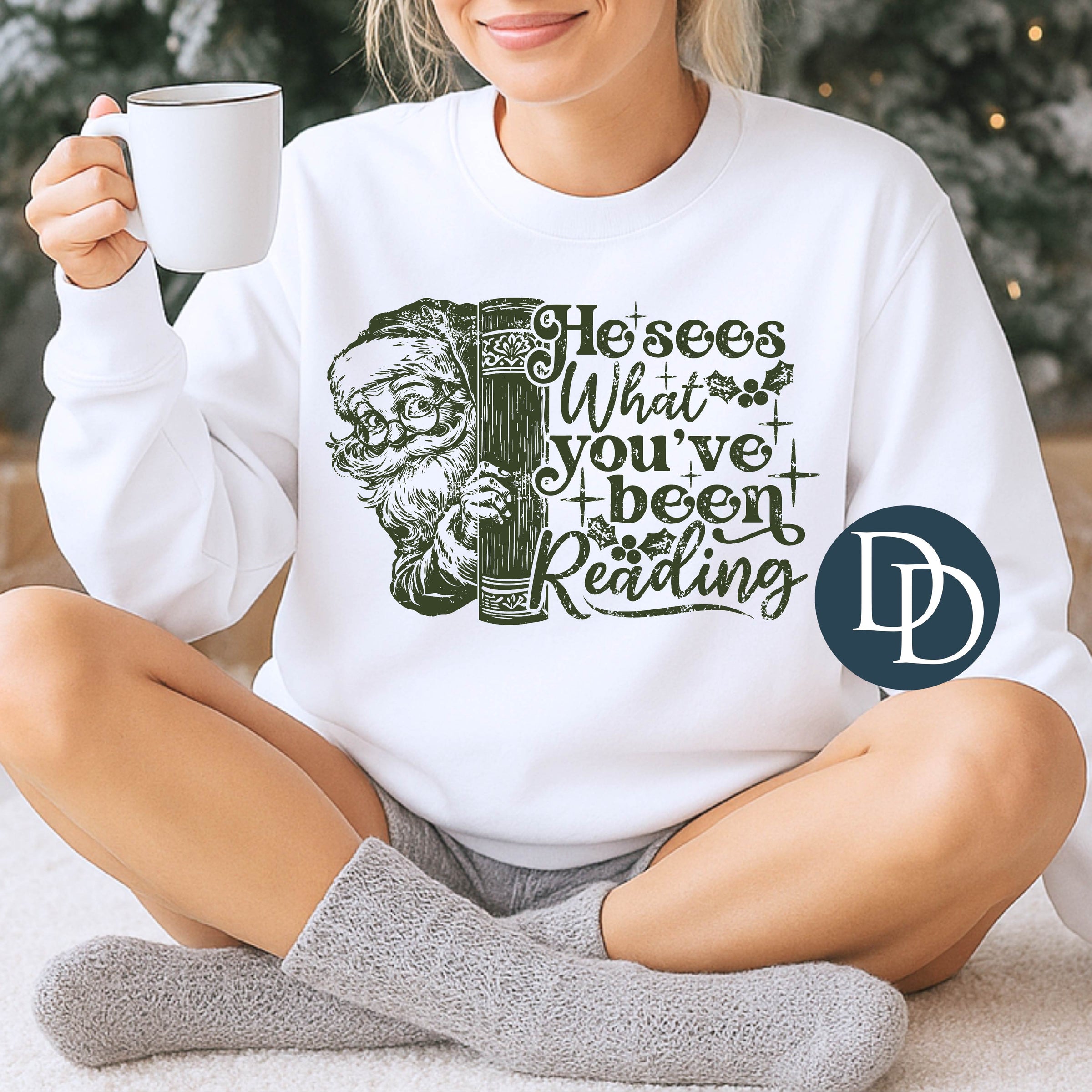 He Sees What You've Been Reading Santa (Hunter Green Ink) *Screen Print Transfer*